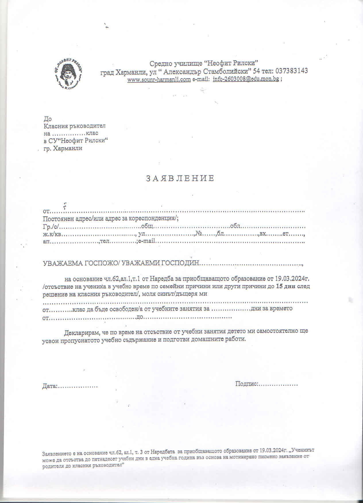 Бележка за отсъствия по семейни причини